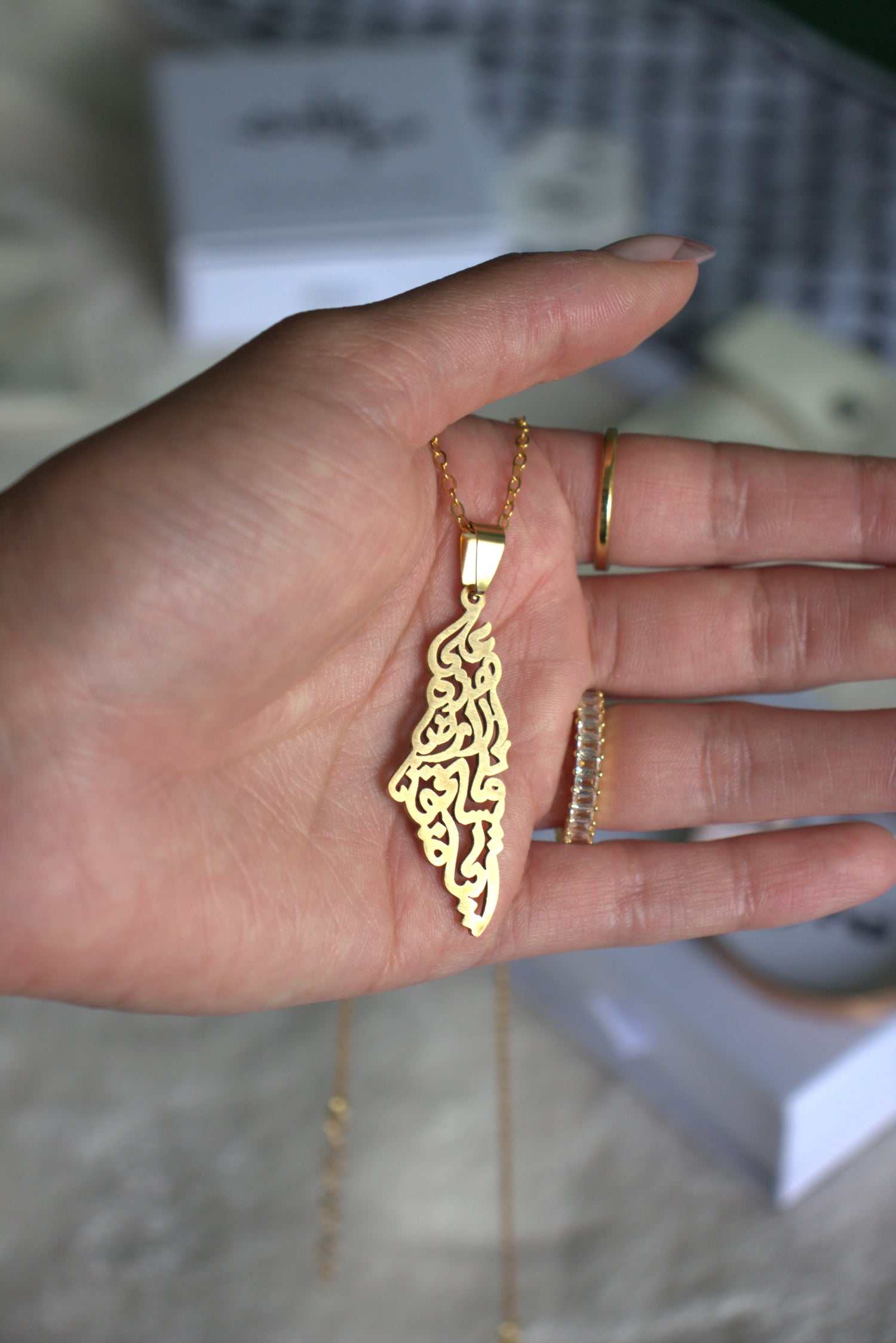 The Palestine Calligraphy Map Necklace is beautifully detailed with Arabic calligraphy within the outline of Palestine, representing resilience and pride in every curve and line.